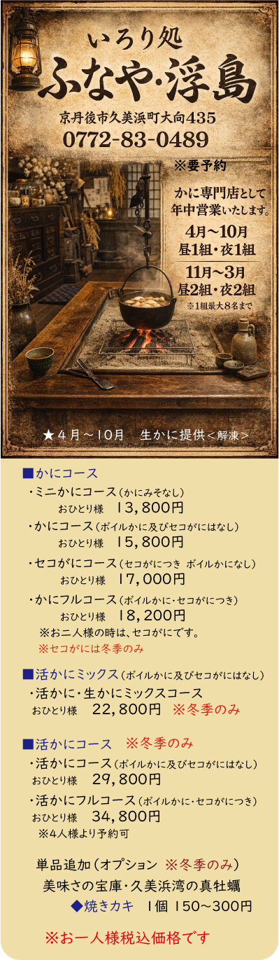 | 京都府久美浜町湊宮 いろり処 ふなや 浮島 店主 稲垣登志子 いろり部屋 個室利用(8室) 電話予約 0772−83−0489 |